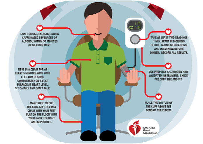 - The cuff should be at heart level. If the placement is too high or too low, it can also skew your readings.